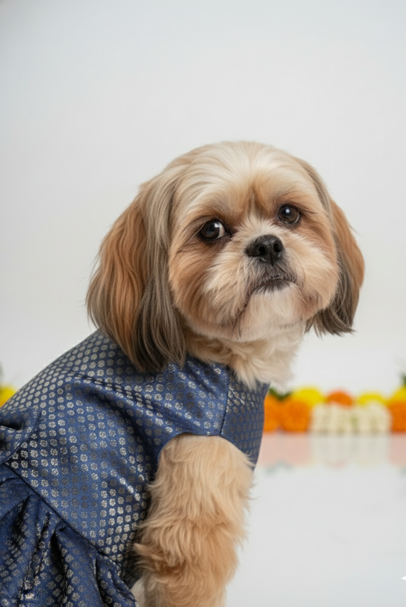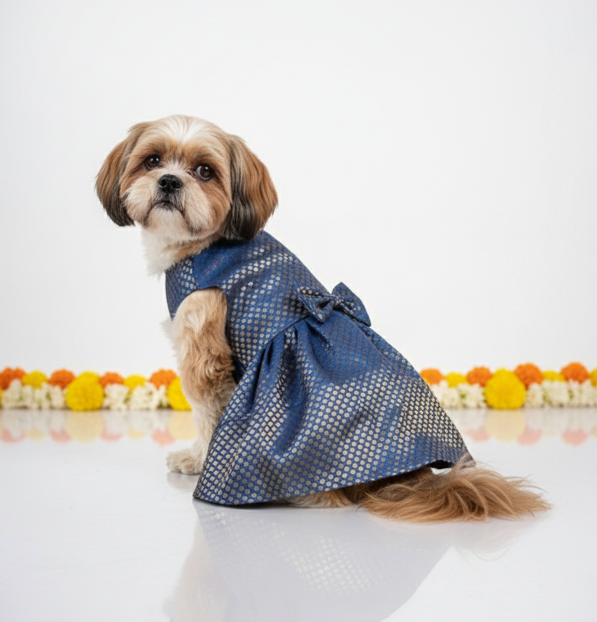 PawTaaka Blue Brocade Bow Dress for Dogs - Festive & Ethnic Wear
