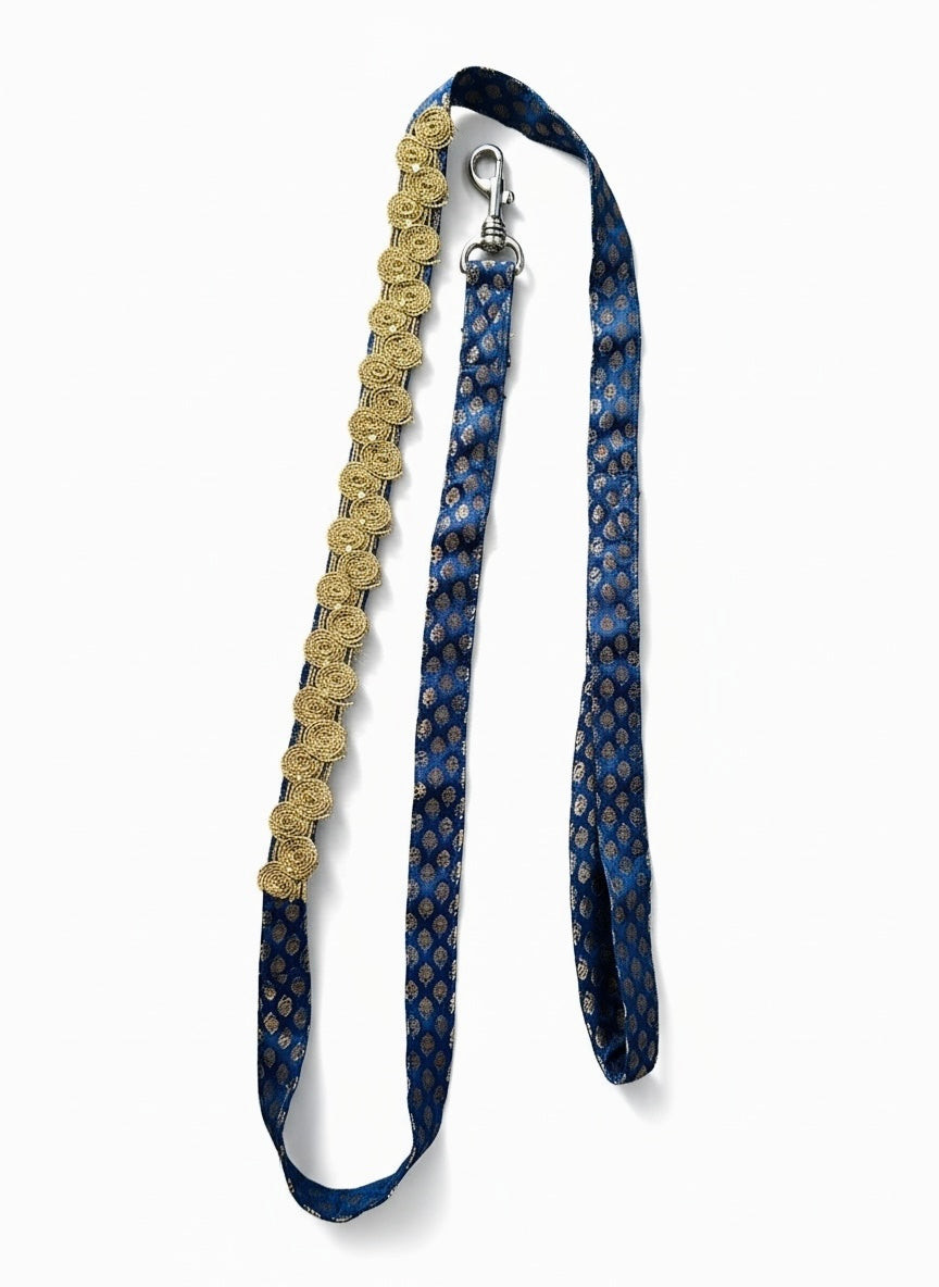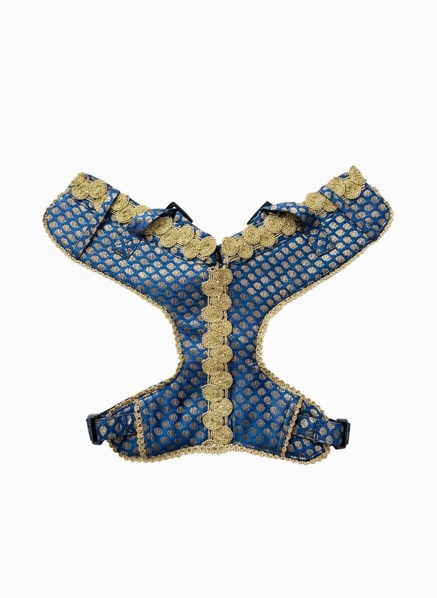 PawTaaka Luxe Gold Lace Harness & Leash – Royal Blue Festive Edition
