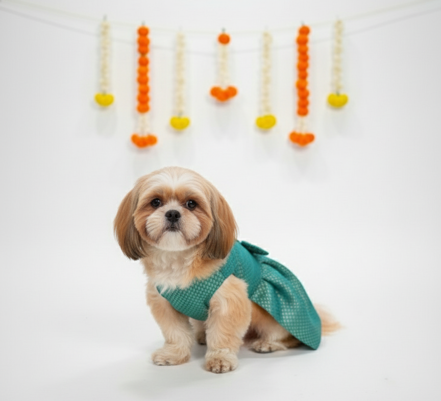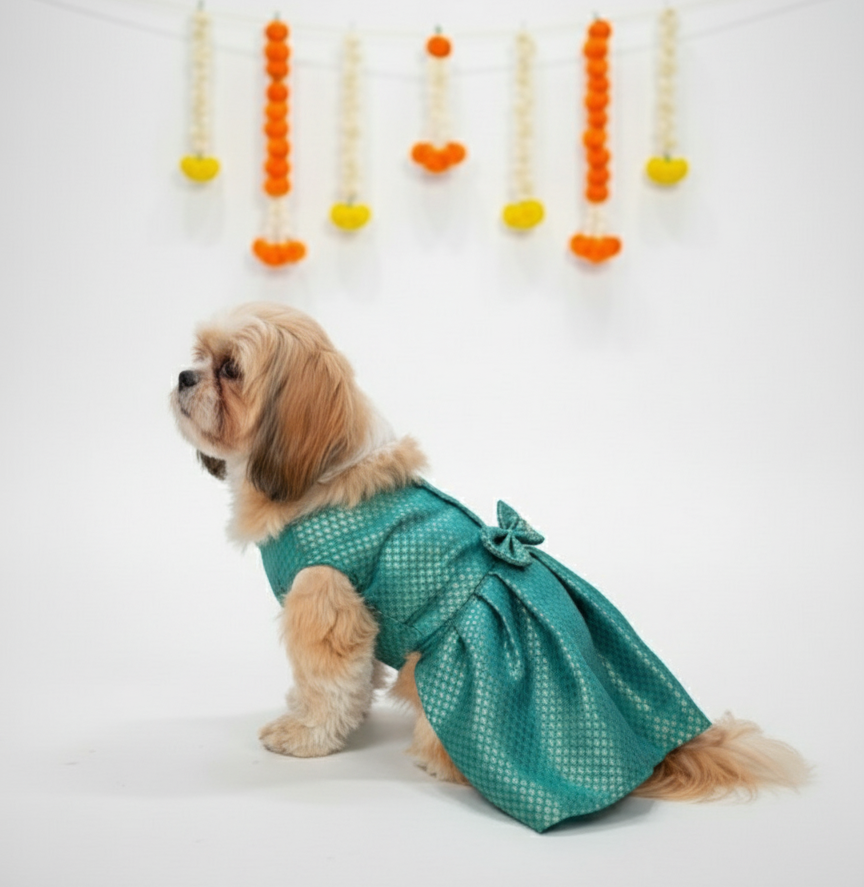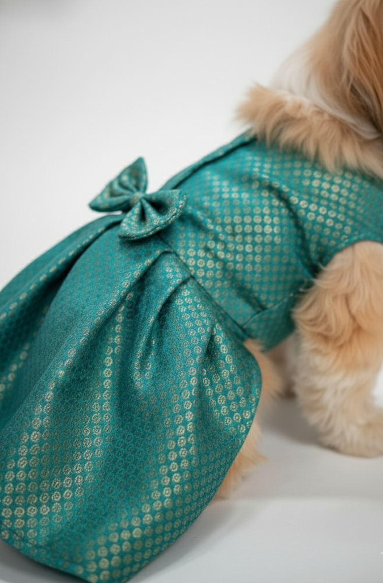 PawTaaka Teal Brocade Bow Dress for Dogs - Festive & Ethnic Wear