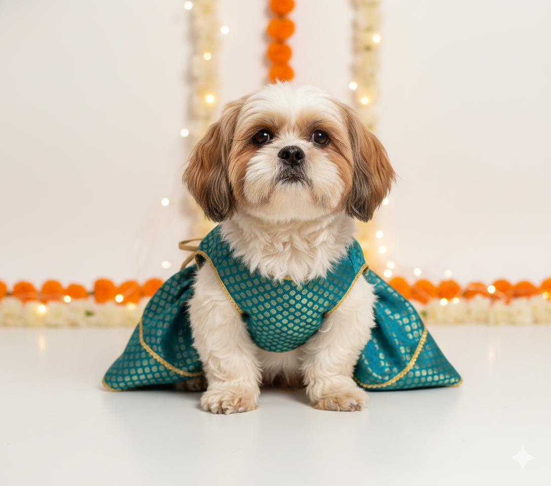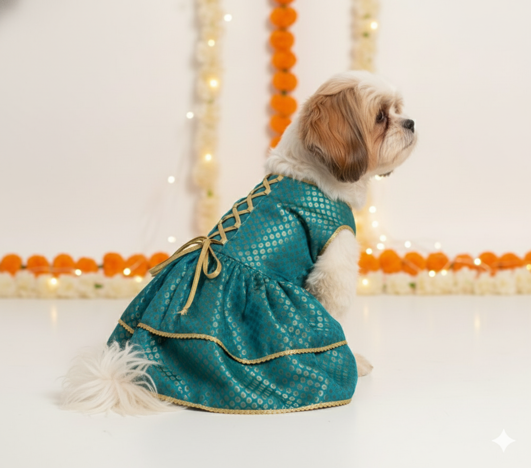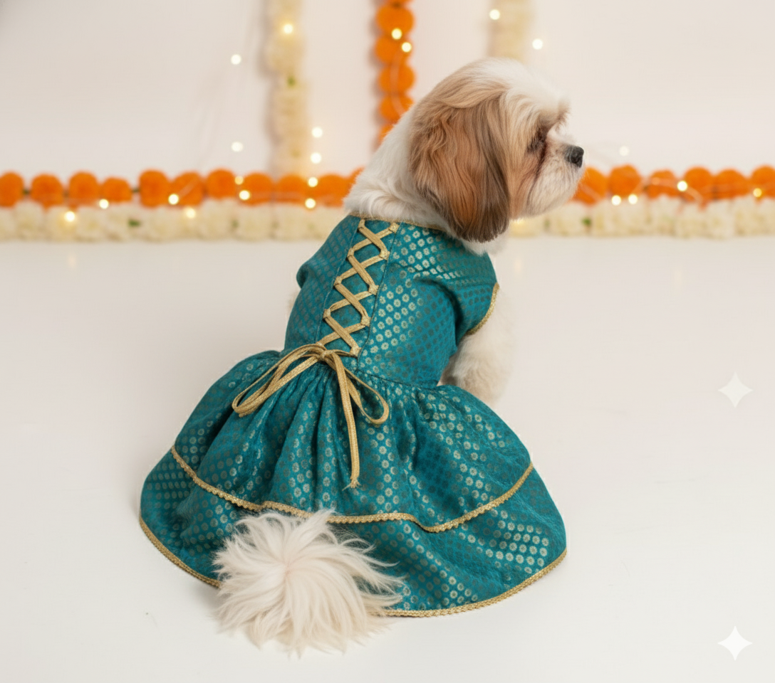 PawTaaka Teal Brocade Pet Lehenga – Wedding & Festive Dress for Dogs
